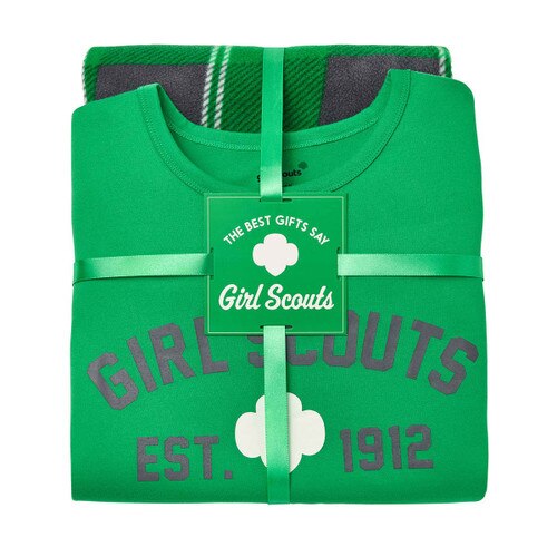We've got your holiday shopping figured out with this perfect pajama set. Includes short sleeve t-shirt and full length pants. Best of all, the set is packaged perfectly to gift, with “The Best Gifts Say Girl Scouts” branding and ribbon detail.