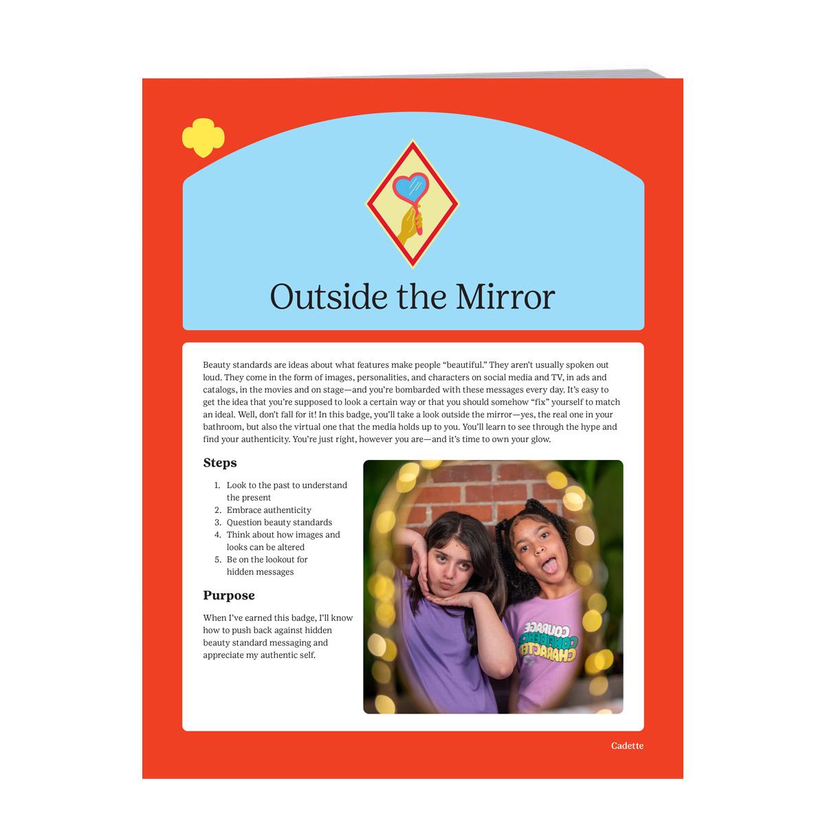 True beauty shines from within, and with the Cadette Outside the Mirror badge you'll explore what makes you uniquely powerful. You will uncover how media and culture shape our ideas about beauty, then flip the script by celebrating authenticity, confidence, and self-expression. Through fun and thoughtful activities, you'll:
