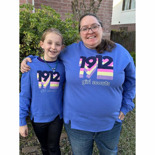 This cozy and classic sweatshirt, in a vibrant periwinkle with bold varsity-inspired chenille 1912 graphic, is perfect for meetings or casual outings, offering both style and warmth.