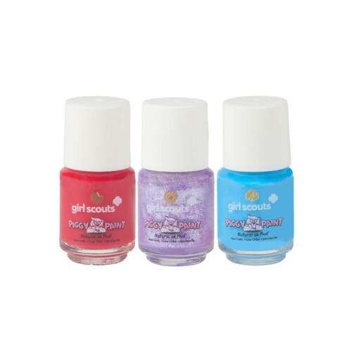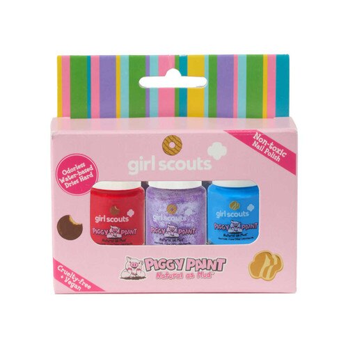 The Cookie Nail Polish Set of 3 adds a pop of cookie-inspired color to your look, featuring shades pulled straight from Girl Scout cookie boxes—red for Peanut Butter Sandwich, purple for Coconut Caramel, and blue for Trefoil. Made by Piggy Paint, a non-toxic, virtually odorless nail polish brand, this set is water-based polish, and safe for all ages. Packaged in a charming gift box, it’s perfect for gifting or as a stocking stuffer for cookie fans of all ages. 0.25 fl. Oz each. Made in the USA.