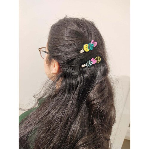 Add a touch of charm to your hair with our Cookies and Dots trio barrettes. This delightful set of two silvertone alligator clip barrettes feature a colorful cookie trio design that's sure to bring a smile to your face. Each barrette measures 1” in height and 2 ¼” in width, making them the perfect size for securing your hair in place while adding a playful flair to your look. 1” H x 2 ¼” W. PVC (90%) and iron (10%). Imported.