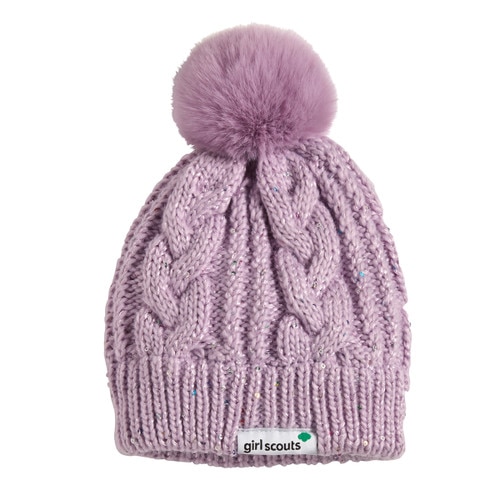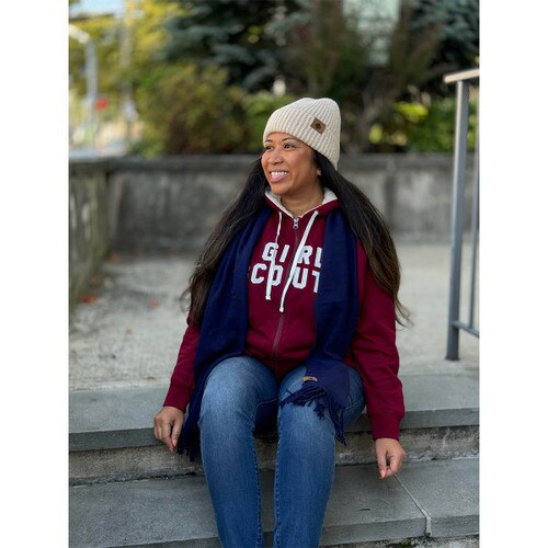 Embrace the cold weather in style with this beanie and scarf set, crafted for ultimate comfort and warmth. The ribbed fold-over cuff cream color beanie is made from a soft and lightweight yarn, ensuring all-day comfort whether you're out on adventures or staying cozy indoors. The navy scarf boasts a soft cashmere-like feel, crafted from brushed acrylic, perfect for everyday wear with its lightweight and comforting touch. Both the beanie and scarf feature a faux suede “Girl Scouts” tab. Scarf is 12” W x 72” L, beanie is 8 ¾” W x 8” H x 1” D. Scarf is made of soft, brushed acrylic, beanie is made of acrylic (60%), nylon (35%) and elastic (5%). One size fits most adults and older girls. Imported.