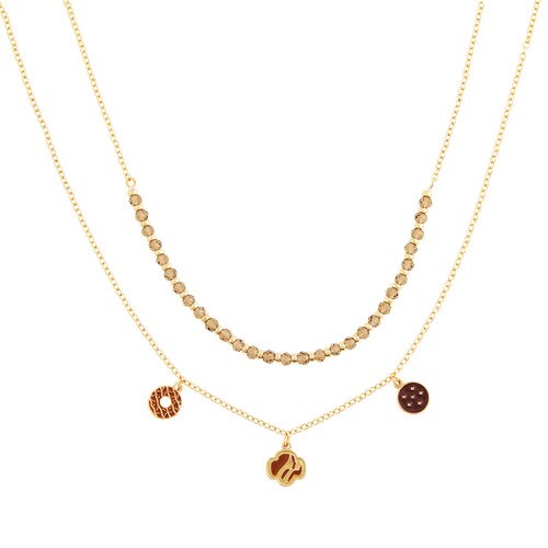 Add a touch of sweetness to your style with a layered necklace. Featuring a delicate row of shimmering beads and a sleek chain adorned with three iconic cookie charms. Whether you're a lifelong fan or simply love a whimsical accessory, this necklace is a charming way to celebrate your favorite cookies in style. 1st necklace: 16" + 2" extender & 2nd necklace: 18" +2" extender. Imported.