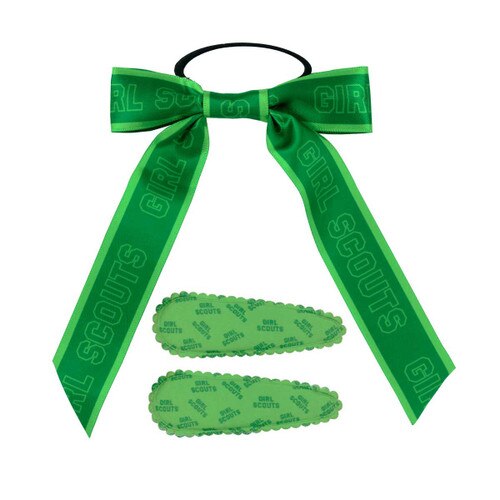 Accessorize with a touch of fun and flair with these barrettes and bow set. In green with “Girl Scouts” print, these accessories are the ideal finishing touch for any look. Pair them with the Trefoil Tie-Dye shirt for girls and adults. Polyester (75%), iron (15%) and rubber (10%). Imported.