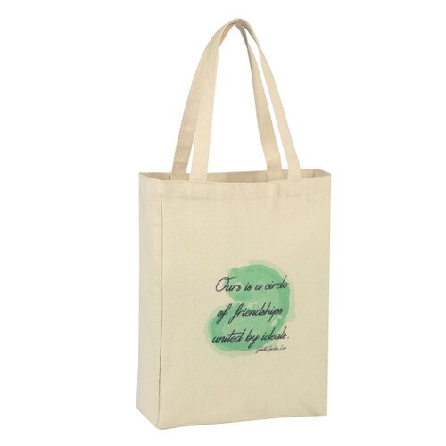 Carry a piece of history with you! The front of this classic bag features the JGL quarter dollar design. On the back is the famous quote from our founder, “Ours is a circle of friendship united by ideals” over a green watercolor brush stroke design. 14” W x 16” H. Cross-stitched cotton web straps are 19” L x 1” W. 12 oz. cotton canvas. Imported.