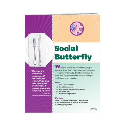 This 8-page pamphlet provides the steps needed for the Junior age level girl to earn her Social Butterfly Badge. Badge sold separately. Pamphlet is three-hole punched to fit into a binder. Each pamphlet is individually packed in a polybag. Printed in the USA.