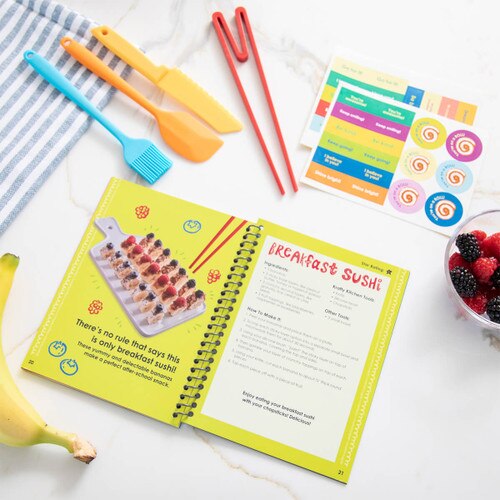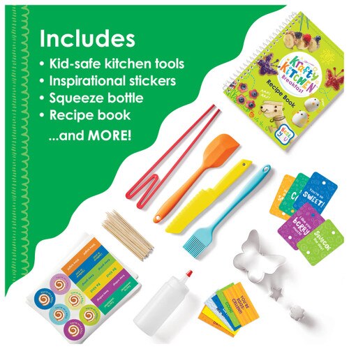 Includes: child-safe knife, silicone brush, silicone spatula, butterfly-shaped food cutter, star-shaped food cutter, flower-shaped food cutter, plastic squeeze bottle, training chopsticks, 15 bamboo skewers, 15 flag stickers, 6 cinnamon roll stickers, 6 smoothie straw sleeves and 1 recipe book with 13 recipes.