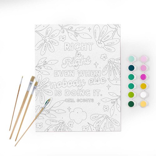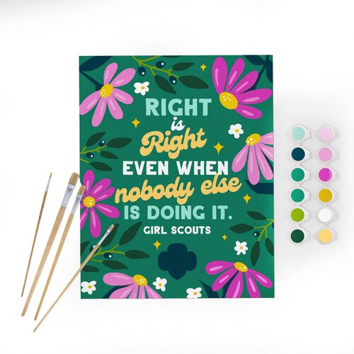 Get your young artist off-screen and into the world of crafting with our custom Girl Scout Paint by Number Craft Kit. With vibrant colors and a simple guide, she'll unleash her creativity while painting her own masterpiece, adorned with the empowering message "Right is Right, Even When No One Else is Doing It." This premium kit not only fosters artistic talent but also instills self-belief and empowerment. More than just a creative outlet, it's a tool for building confidence and resilience in your girl. Invest in her future and inspire her journey of self-discovery today! Ages 8+