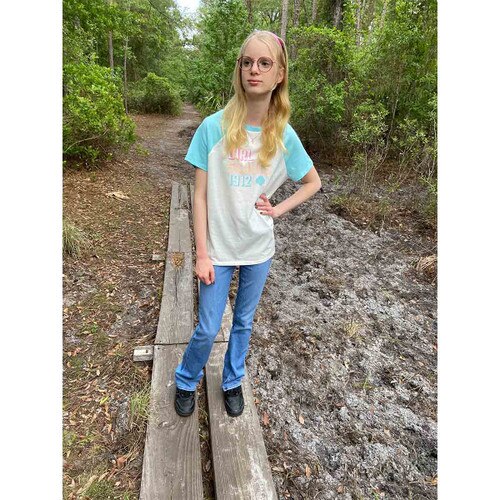 Step back in time and show your Girl Scout spirit with with this retro-inspired t-shirt with baseball sleeves. Off-white tee with blue contrasting sleeves and neck. Accented with multi-color “Girl Scouts 1912” and trefoil graphic for that perfect touch of nostalgia.