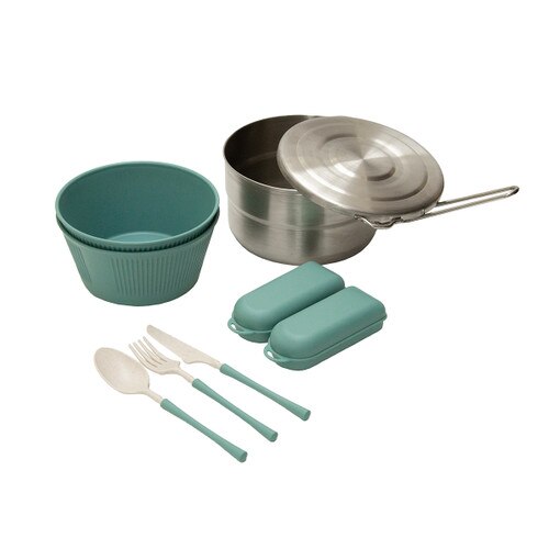 - Set includes: 1 x 1.5 QT pot with lid, 2 x 23.5 oz bowls, 2 x spoon, fork and knife sets with travel cases, and a mesh carry bag