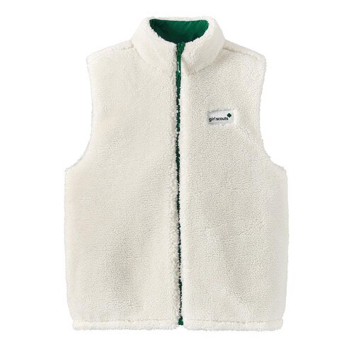 Prepare for transitional temperatures in this multifunctional reversible vest perfect for Girl Scout events. One side features a water-resistant quilted repeating trefoil pattern, and the other couldn't be cozier with a rich fleece and Girl Scouts servicemark branding. Also available for girls.